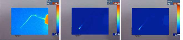 Temperature profiles along the heat pluggers detected from the thermal imaging camera. (A) Profile of the heat plugger before heating; (B) profile of the heat plugger after heating with System B; and (C) profile of the heat plugger after heating with System MB.