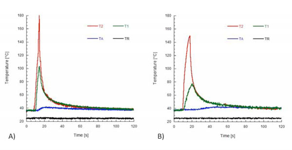 Peak temperature levels and the rate of temperature increase recorded by the thermocouples TA, T1, and T2 for System B and System MB.