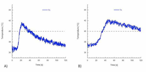 Temperature profiles at the root apex recorded with (A) System B and (B) System MB.