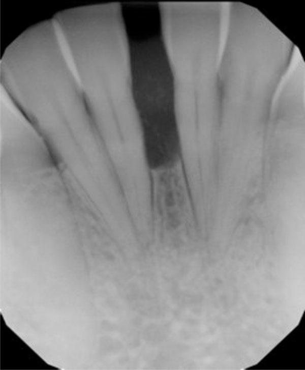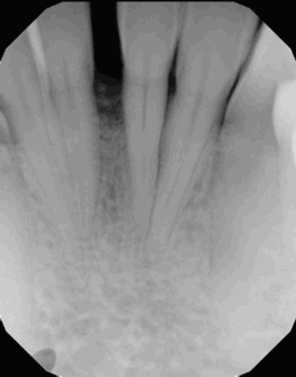 Severe vertical bone loss is evident on this image of mandibular central incisors.
