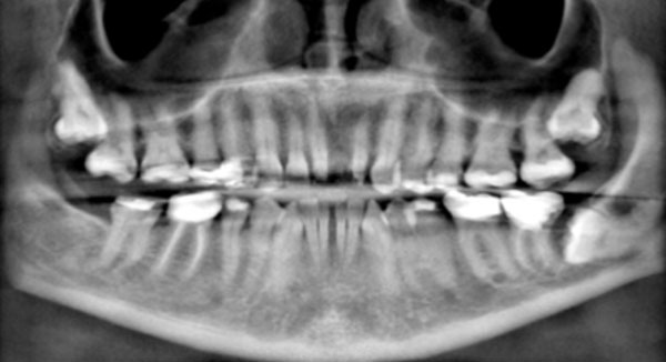 Reconstructed panoramic radiograph shows impacted teeth, missing teeth, and migration of teeth. The mandibular left third molar is horizontally impacted against the distal surface of the second molar. The root of the molar appears to be irregular, potentially suggesting root resorption.