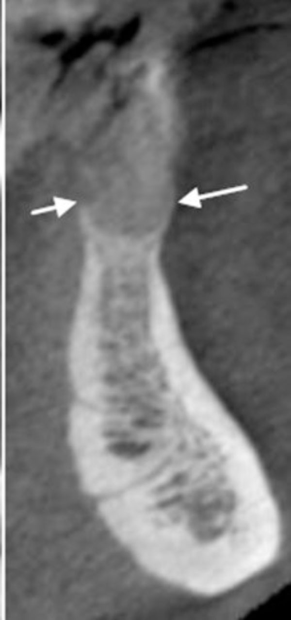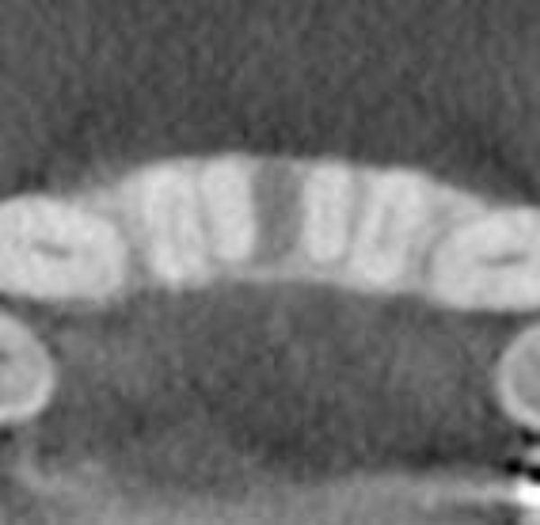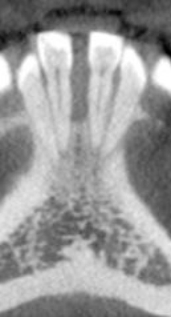 A well-circumscribed, low-density, radiolucent lesion presented between the two mandibular central incisors. The buccal and lingual cortical plates appeared to be thinned and expanded (Fig. 1f).