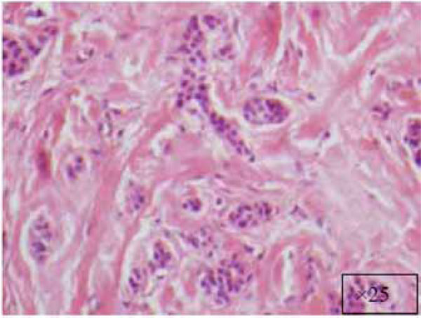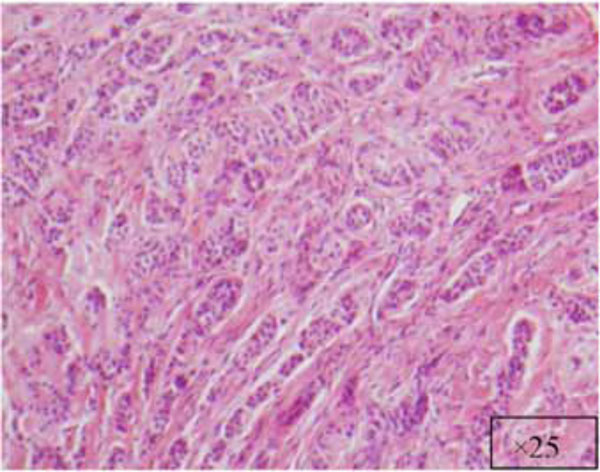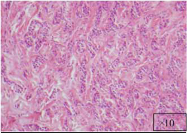 A cellular fibroblastic connective tissue containing numerous cords and nests of odontogenic epithelium (x5).