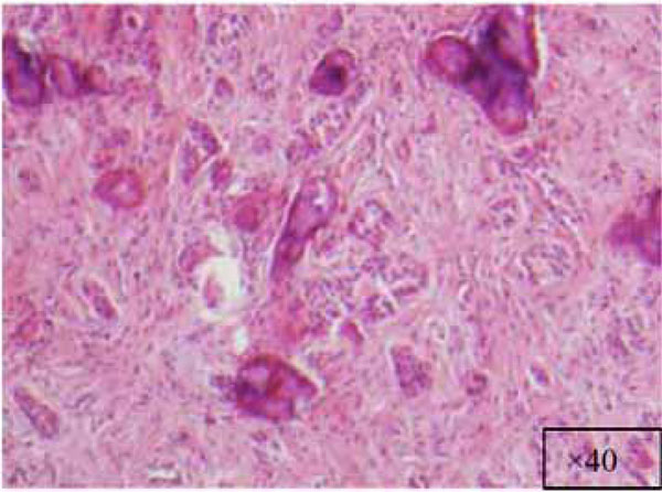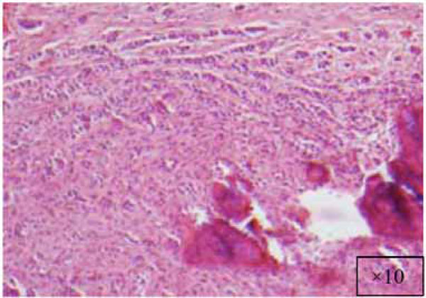 3) A more complicated lesion with features of dysplastic dentin or cementum-like tissue and varying amounts of odontogenic epithelium (WHO type). As this group is similar to the calcifying odontogenic tumor described by Pindborg in a WHO publication in 1971 [2, 12], Gardner designated it as odontogenic fibroma (WHO type) [3]. The two lesions can be distinguished by the fact that, the calcifying odontogenic tumor stains positive with amyloid stains, but the odontogenic fibroma (WHO type) does not.