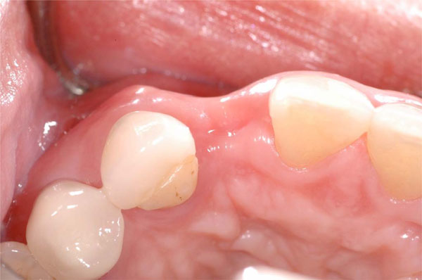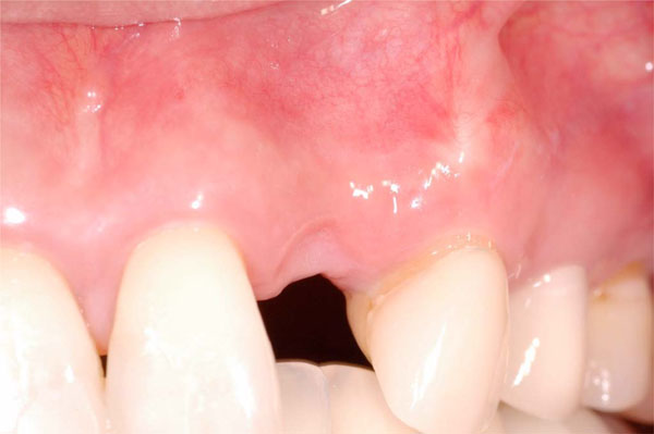 Extraction site defect 6 months after tooth removal without ridge preservation. Note buccal depression and loss of vertical height at site #10.